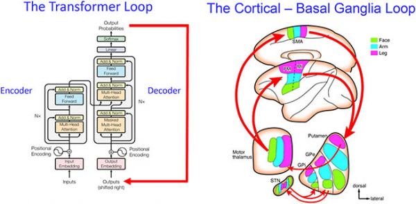 图注:变压器回路与皮层-基底核回路的比较。(左图)变压器具有前馈自回归架构,可将输出与输入循环以生成单词序列。所示的单个编码器/解码器模块可以堆叠N层深(Nx)。(右图)运动皮层局部解剖图投射到基底核,循环回到皮层以产生一系列动作,例如口语交流中的一连串词语。大脑皮层的所有部分都投射到基底核,而前额叶皮层和基底核之间的类似回路会产生思维序列。