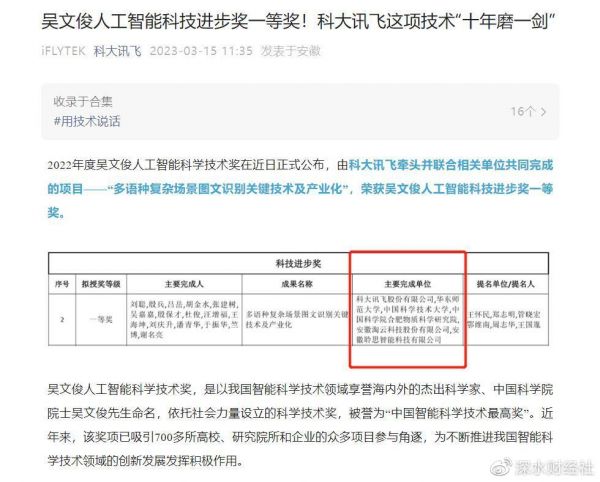 值得一提的是,3月15日,科大讯飞官方微信公众号发布消息称,由科大讯飞牵头并联合相关单位共同完成的项目——“多语种复杂场景图文识别关键技术及产业化”,荣获吴文俊人工智能科技进步奖一等奖。