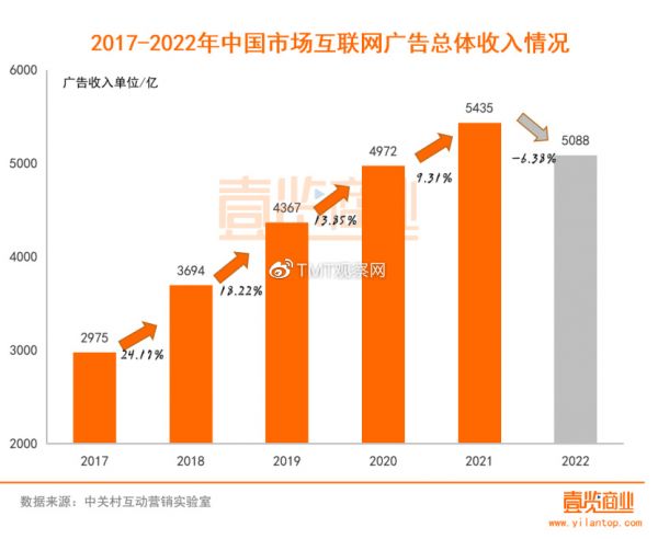 据《2022中国互联网广告数据报告》显示,全年广告收入5088亿,同比减少347亿,这相当于3500家千万营收的MCN公司走向倒闭。