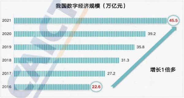 中国信息通讯研究院的数据显示,2021年,我国数字经济规模达到45.5万亿元,较“十三五”初期扩张了1倍多,同比名义增长16.2%。