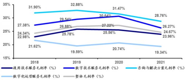 上述每一个板块营收都处于快速增长的通道中。其中,较为成熟的通用技术服务增速相对较慢,2021年仍然达到17.84%;咨询与解决方案、数字技术服务两项收入去年增速分别为31.67%、38.67%;数字化运营服务增速达61.38%。