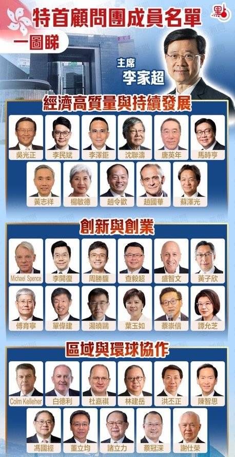 同样引人注目的是,3月17日,香港特区政府公布成立特首顾问团,由行政长官担任主席并委任34名成员。主要政府官员亦会参与。顾问团首届任期即时生效,至2025年6月30日止。