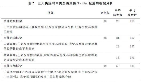 在对传播效果的评估中,我们常常运用框架分析(framing analysis)的方式来进行研究。戈夫曼首次将框架的概念引入传播学中,他认为,框架为事件提供了一种原始解释(original interpretation)的范式,人们往往需要依赖一套策略和框架来理解外部世界(Goffman,1974,p.21),而新闻本身就给人们提供了一套认识和理解世界的路径,通过对新闻事件的选择、加工与阐释,使之置于特定的意义体系之内(潘忠党,2006)。框架分析不仅关注受众在想什么,还关注受众怎么想,即媒体报道如何影响人们对某一议题的价值判断(陈阳,2007)。关于新闻框架分析的研究主要包括两种路径:其一是将框架作为自变量,考察框架对受众认知以及态度的影响,其二是将框架作为因变量,关注框架的建构方式与过程(Scheufele,1999)。本文采取第二种研究路径,旨在分析三大央媒在Twitter报道中,对中美贸易摩擦议题所呈现的报道框架。