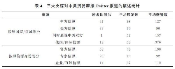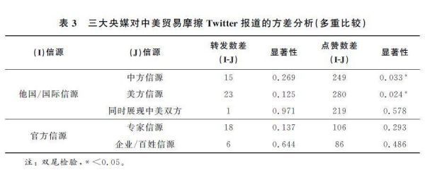 以国家/区为标准,将信源分为中方、美方、中美双方以及他国/国际信源,对其进行方差分析(见表3)。首先从信源采用的频率来看,不同信源的转发频数并没有表现出显著差异,数量上来看中方信源所占比重最大(47%),而国际信源占较低(19%);其次从受众的点赞数量来看,相较于中方信源和美方信源,采用国际信源的推文在点赞数以及转发量方面更具优势,并且在统计学上表现出了显著差异,即使用他国/国际信源进行报道时,获得的点赞数要显著高于使用中方信源与美方信源的点赞数(见表4)。这说明,对于这样一个具有全球性影响的议题,国际受众更倾向于听到非事件主体国的声音,这使得采用他国信源的推文更受欢迎。此外值得注意的是,有两条推文在140字的内容中同时展现了中方信源和美方信源,并获得了受众较高的关注及评价。这说明在有限的字数中展现多方信源,将成为提升传播效果的途径之一。