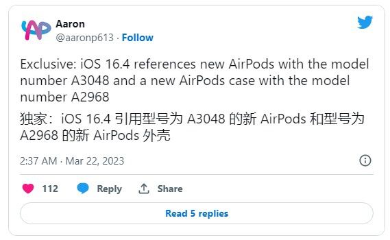 IT之家 3 月 22 日消息,开发者 @aaronp613 深入挖掘今天发布的 iOS 16.4 RC 版本,在系统代码中发现了型号为 A3048 的 AirPods 耳机、以及型号为 A2968 的 AirPods 保护套。