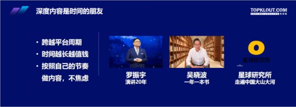以吴晓波老师为例,他的内容创作节奏感非常强,他将近20年的时间,每年他坚持至少写一本书,他说他写一本书至少有三本书的选题在规划当中。他从2004年就开始在报纸上写专栏,每个星期固定写一个专栏这么多年坚持下来,你会发现这些时间的复利效果是非常惊人的,我们看到有很多跨越时间周期,跨越平台周期的内容都有一个共同的特点,它是有规划,有节奏的。比如说罗振宇会说我要做一个20年的演讲,20年不间断。吴晓波我每年出一本书,出一本书是你对社会的承诺,你对出版机构的承诺就会人愿意跟你一起成长,投资你的内容。包括这两天比较火的星球研究所他提的说我们要走遍中国的大山大河,虽然很不容易但是我们愿意花时间去,这都是非常好有规划有节奏的,它会抵御很多平台变迁和热点变迁带来的焦虑。