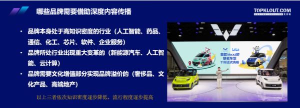 第一个是品牌本身处于高知识密度的行业,比如说像人工智能、药品、通信、化工、芯片、软件和企业服务,因为它这个行业的故事理解成本比较高。我举个例子,像钉钉和飞书都是我们的客户,飞书今天在开发布会,它的用户主要是企业,它的产品理解起来有很高的门槛,它必须要通过深度的内容做传播,比如说要做企业纪录片到工厂里面访谈,它必须要做一些和产业相关的内容。包括KOL这个词最早是医药行业率先发明的,为什么呢?因为医药大家知道,主要是医生开处方药,它的主要传播对象首先是医生,所以最早的KOL是在医生这个群体里面起来的。