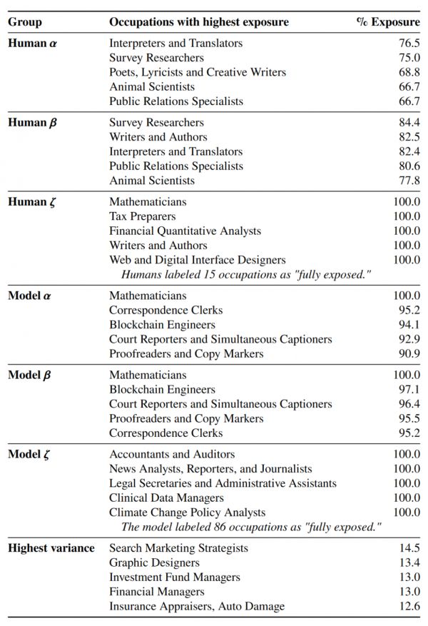 然后,OpenAI 让人类和 GPT-4 来评估:如果一项工序在质量不变的情况下,使用 AI 能够减少其 50% 以上的时间,那么它就是可替代的 —— OpenAI 的原话叫做“暴露于 AI”。如果一项工作的多数工序都暴露于 AI,那么这项工作就是暴露于 AI 的。