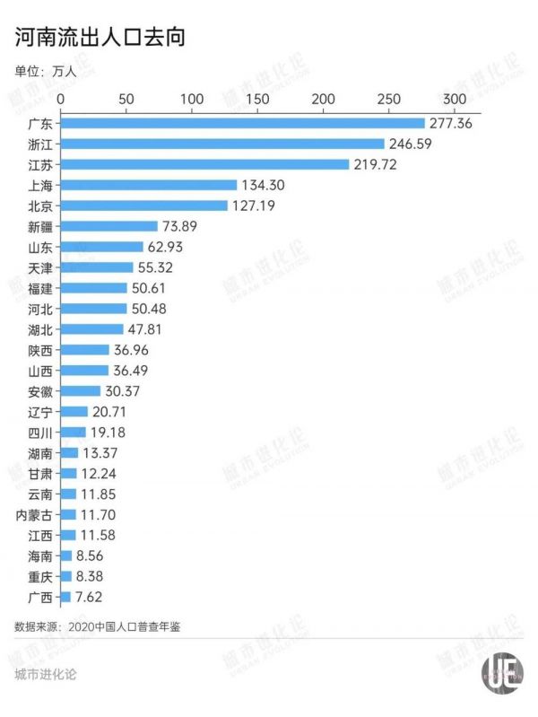 这一流出规模也意味着,河南人的足迹几乎遍布全国各省,为特别是沿海城市的建设发展贡献了重要力量。根据河南省统计局公开的数据,2020年,河南省的出生流出人口主要流向广东、浙江、江苏、上海等地。