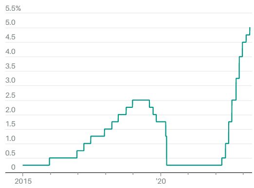从美联储发布的政策声明和官员们对经济的预测来看,这一轮加息可能正在接近尾声。联邦公开市场委员会(FOMC)18名成员的预测中值显示,到今年年底,联邦基金利率将升至5.1%,官员们对2024年利率峰值的预测中值为4.3%,对2025年利率峰值的预测中值为3.1%。