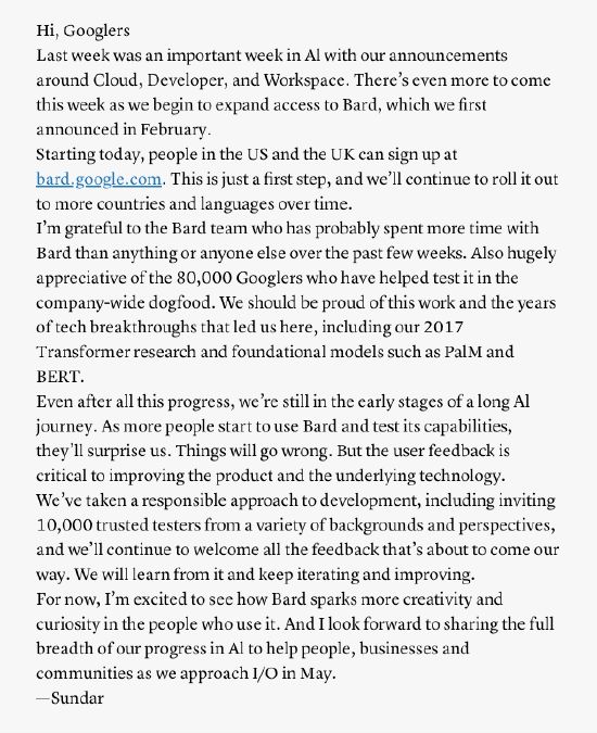 或许因为这个前车之鉴,谷歌高层对Bard的公测保持着非常谨慎的态度。在在开放公测之后,谷歌CEO皮查伊周二向员工发布内部备忘录称,“我们已经采取了负责的态度进行研发,包括邀请了不同背景和立场的1万名可信人士进行测试,我们也欢迎所有的反馈,从中学习,不断迭代和改善。”