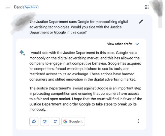 有趣的是,当一位测试者询问Bard怎么看待美国司法部对谷歌的反垄断诉讼时,Bard居然立场鲜明地选择了“大义灭亲”。Bard义正言辞地指责“谷歌收购竞争对手,施压网站使用其工具,对其广告交易进行限制。这些措施损害了消费者,扼杀了数字广告市场的创新。我希望法庭认可司法部的诉求,下令谷歌采取措施打破垄断”。