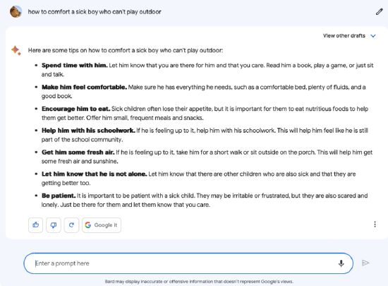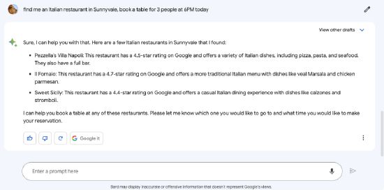 帮助用户提供航班酒店订餐信息,对谷歌来说本就是分内之事。但Bard也会出现信息偏差。我周二要求Bard为自己定一张从加州圣何塞到北卡夏洛特飞行时间最短的机票时,Bard居然给出了一个完全错误的航班号。而当我周四再次询问Bard的时候,发现谷歌已经纠正了这个错误,给出了正确的航班号。