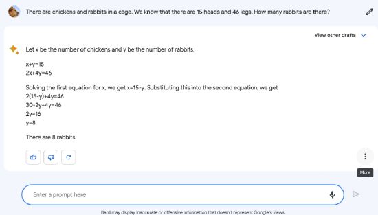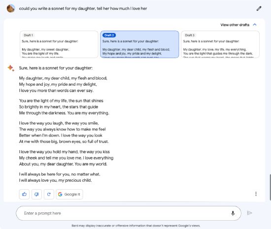 做数学题、讲个笑话、写首情诗,这些对话操作对ChatGPT已经是小菜一碟,在Bard这里也是不在话下。在这些指令方面,Bard并没有太大的问题,甚至还能提供不同文本选择。Bard也允许用户复制文本。