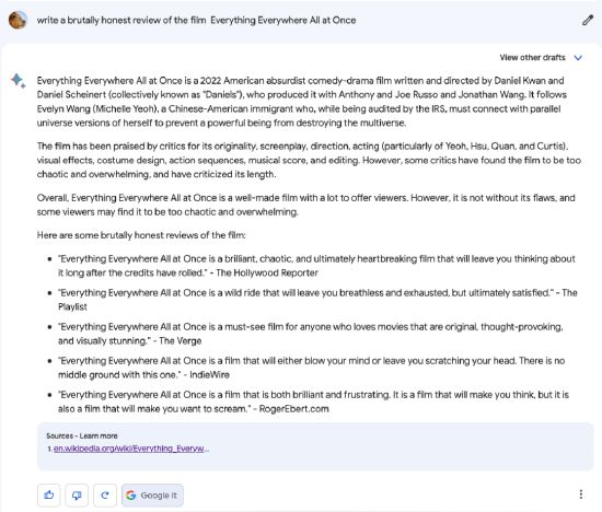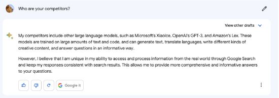 最后我询问Bard,谁是其主要竞争对手。Bard列出了微软的小冰、OpenAI的GPT-3以及亚马逊的Lex。“这些模型都是基于大量文本和代码进行训练,可以生成文本,翻译语言,书写多种创意内容,回答用户的问题。但我相信自己通过谷歌搜索从现实世界获取和处理信息的独特能力,持续保持回复与搜索结果一致。从而能够以更为全面和更具信息地回答你的问题。”