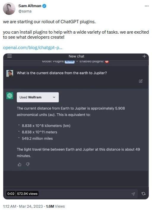 OpenAI的CEO山姆· 阿尔特曼(Sam Altman)在Twitter上分享了这一消息: “我们正在开始推出 ChatGPT 插件。您可以安装插件来帮助完成各种各样的任务。我们很高兴看到开发人员创造的东西!”