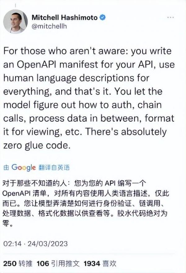 “对所有不明白的人解释下:你为你的API编写一个OpenAI清单,对所有内容使用人类语言进行描述,仅此而已。你让模型自己去搞清怎么做身份验证、数据处理等。”一位声称自己“做过无数插件”的人,将ChatGPT的插件称为其见过“最疯狂的”。