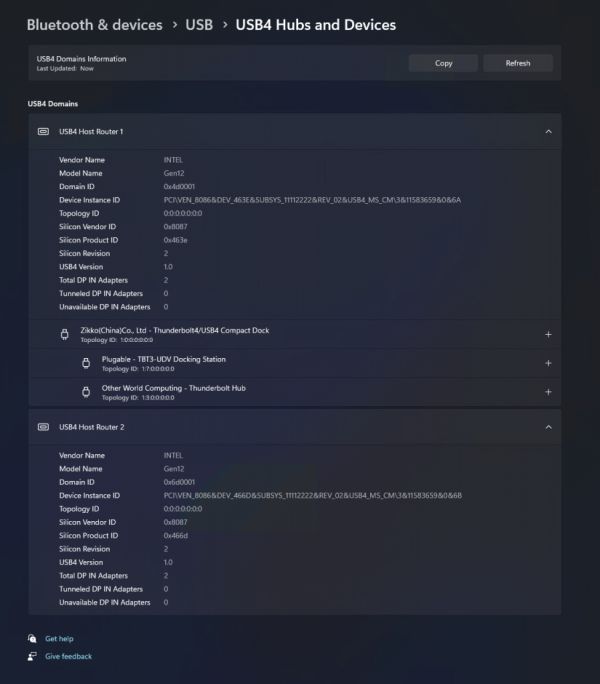 微软正在设置 > 蓝牙和设备 > USB > USB4 Hub 和设备下为用户添加 USB4 Hub 和设备设置页面。USB4 为扩展坞、高性能外围设备、显示器和充电提供了新的生产力场景。USB4 设置页面提供有关系统的 USB4 功能和支持 USB4 的系统上连接的外围设备的信息。如果用户需要设备制造商 (OEM) 或系统管理员的支持,这些旨在帮助进行故障排除。该页面提供的功能包括: