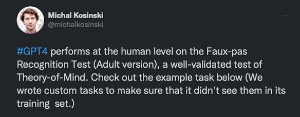 喜欢搞大新闻的科辛斯基教授,最近依然努力:GPT-4公布当天,他就在推特上发布了针对新版本GPT的心理理论能力测试结果。这次他使用了针对成人的心理理论范式,实验结果用他的话说:“GPT4具有与成人水平相当的心理理论能力”。