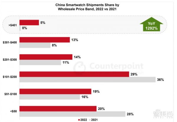 小米的智能手表主要属于200元以下的细分市场。由于100-200美元和50美元以下细分市场的需求萎缩,小米在中国市场的年销售额在2022年同比下降18%。2022年,在新发布的OPPO Watch 3系列的推动下,OPPO销售额同比增长105%,市场份额增加到3%。