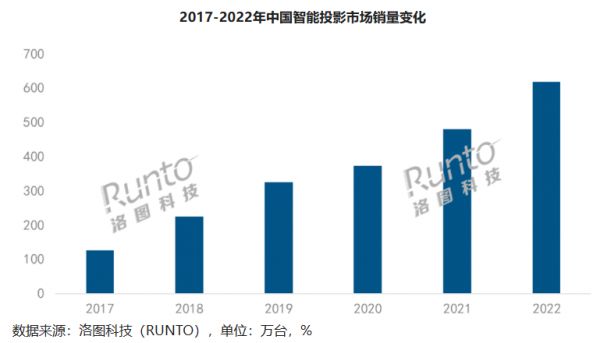 洛图科技发布的报告中显示,2017年国内智能投影(不包含激光电视)的销量仅有100万台左右,到了2022年其规模已经达到617.8万台,同比增长28.6%。洛图科技预测,2023年国能智能投影的销量有望达到735万台,比去年增长117万台,增速接近20%。短短五年,其中还包含疫情最艰难的三年,智能投影的销量已经翻了数翻,可以看出行业需求正在被点燃,属于智能投影的时代正在悄然到来。
