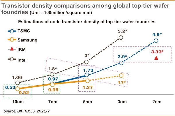 台积电、三星、IBM、英特尔各节点晶体管密度对比图(图源:电子时报)