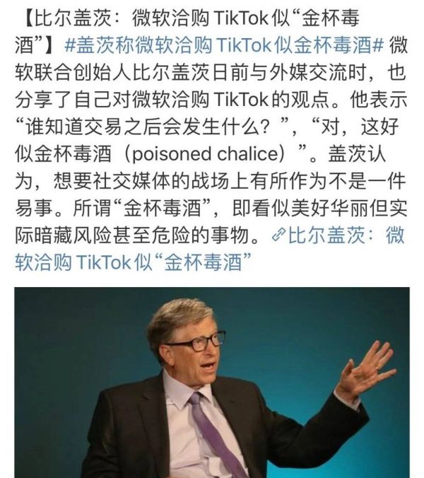 上一轮川普政府时,传闻的买家是微软。一开始,TikTok业务估值是500亿美金,这个定价尚算公允,变现也不算亏;后来比较复杂,据说微软是想收购TikTok的美、加、澳、新所有业务,出价只肯给100亿美金,只有最开始的五分之一,这确实有趁火打劫之嫌。比尔·盖茨放风说这次收购可能是“金杯毒酒”,未必符合微软的长期战略和利益。