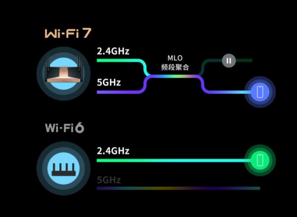 Wi-Fi 6 技术仅允许设备同一时间连接 2.4GHz / 5GHz 其中一个频段,而 Wi-Fi 7 支持 MLO 技术,可以实现两个频段聚合使用,数据传输有效吞吐量大幅提升,或者遇到某个频段干扰或负载较大时,可以自动切换到其它频段,提升抗干扰能力,降低时延。