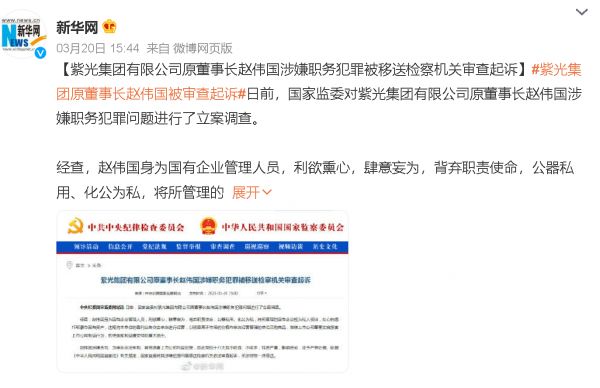 据官方近日通报,国家监委对紫光集团有限公司原董事长赵伟国涉嫌职务犯罪问题进行立案调查了。
