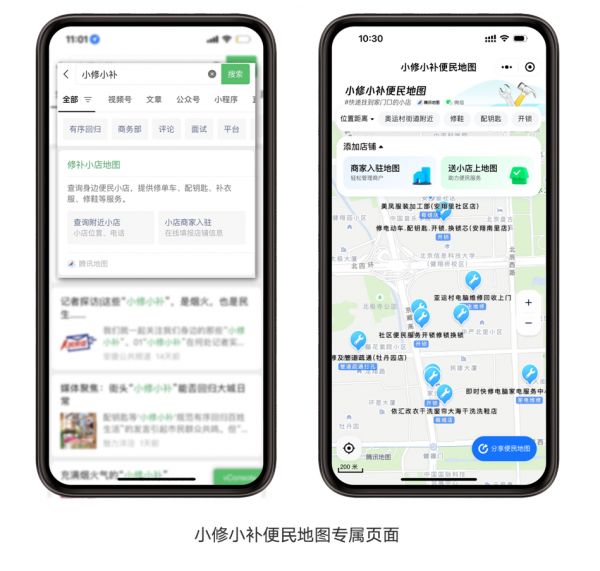 「“小修小补”引路行动」项目相关负责人表示,修补小店是城市居民真实存在的民生需求,但寻找“小修小补”服务往往藏在街头巷尾,甚至可能没有一块招牌,不像叫外卖、打网约车那么容易。“这项行动就是要整合腾讯地图和微信的优势能力,让‘小修小补’成为更多市民找得到、用得上的便民服务,让“小修补”里的“大民生”回归数字世界的视野。”值得一提的是,「“小修小补”引路行动」不但把已有的修补小店和市民需求对接起来,还能让新增的修补小店获得更多数字化帮扶权益。进入“小修小补便民地图”后,“小修小补”店主都可以通过“商家入驻地图”按钮,自主填写店铺信息、完成资质认证。信息通过审核后,便可以在地图上“点亮”自己的店铺,获得更多的地图曝光。未来,腾讯地图还计划为更多入驻小店提供免费“地图权益”:例如地图加V认证、小店信息后台管理、店铺经营洞察等系列数字化权益。