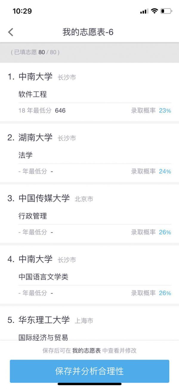 记者下载“优志愿”App并付费300元后,得到了该App推荐的858组专业推荐,如属于“冲刺”的武汉大学哲学类专业预测位次为6036名、“保守”的湖南大学汉语言文学专业的预测位次为8311,考生可以根据自己的高考位次进行对比,在858组专业中选择自己心仪的80组生成一张模拟的志愿表。据这款App介绍,已有22万余人次充值成为vip。