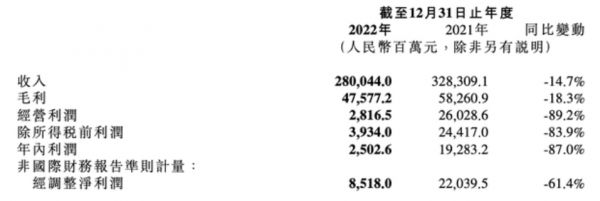北京时间3月24日晚间,小米集团发布了2022年第四季度及全年业绩公告,2022年实现总收入人民币2800亿元,同比下降14.7%;经调整净利润人民币85亿元,同比下滑61.4%,这是小米自上市以来首个营收、利润双双下跌的财年。