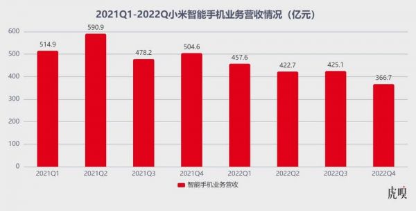 如果细化到各个季度,智能手机业务的失速要更加明显。财报显示,2022年第四季度,小米智能手机业务同比下滑27.3%至366.72亿元。