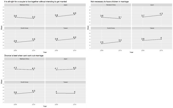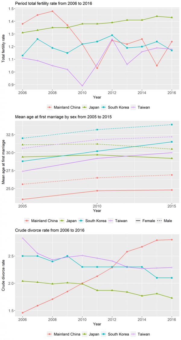 由于第二次人口转型强调个体观念变化并以此来解释婚育行为的变化,我们最近发表的研究使用2006年与2016年的东亚社会调查探究中国大陆,日本,韩国与中国台湾地区这些社会中个体家庭婚姻观念在这10年内的变化。