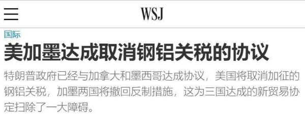 所谓的廉价钢铁产品的来源,不用多说。在美加墨宣布达成协议之前,墨西哥在今年2月份宣布对原产于中国等国家的钢铁产品,重新征收15%的进口关税。