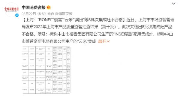 除此之外,据中国消费者报报道,3月份上海市场监管局对集成灶、商用燃气器具等9种产品做了监督抽查,240个批次产品中有37批次不合格,其中集成灶就有8个批次不合格,占比达21.62%。其中奥田、德意、RONFI等品牌的产品都被检测出“结构”不合格。这意味着产品在使用过程中可能因为结构问题,出现故障损坏,甚至是爆炸,真就花几千上万块买了个不定时炸弹回去。