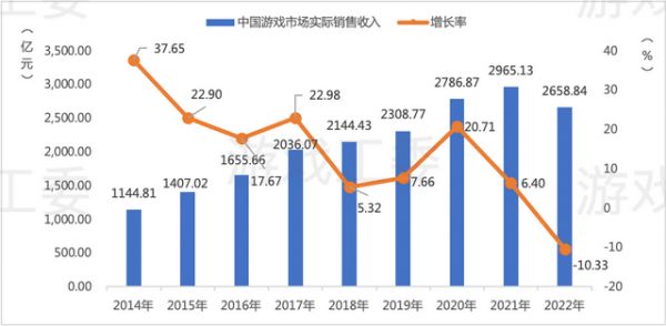 由中国音数协游戏工委与中国游戏产业研究院主导编写《2022年中国游戏产业报告》显示,2022年中国游戏市场实际销售收入为2658.84亿元,同比减少306.29亿元,下降10.33%。