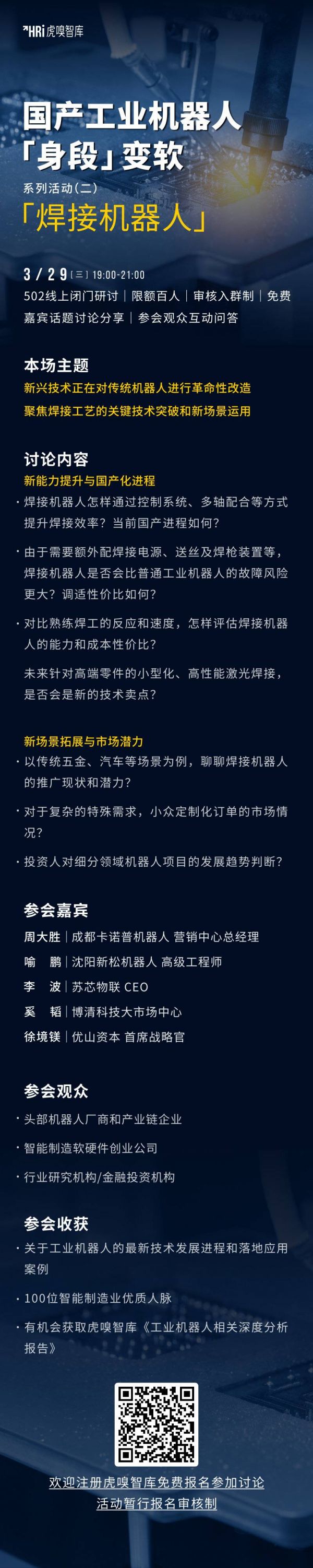 2023年3月29日周三晚七点,虎嗅智库「502线上同行」将邀请成都卡诺普机器人、沈阳新松机器人、苏芯物联、博清科技、优山资本等关键嘉宾,系列探讨国产工业机器人的柔性化,第二期为焊接主题。