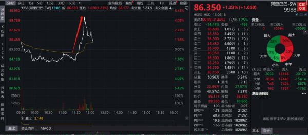 今日上午,关于马云的去向此起彼伏,在11点30分左右,阿里巴巴股价在盘中异动,随后直线拉升至5%,不过,很快阿里股价开始回调。截至发稿,阿里涨1.23%,市值1.83万亿港元。