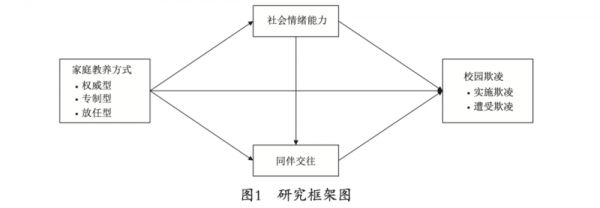 鉴于此,本文将在已有研究的基础上,将个体因素(社会情绪能力)及同伴因素(同伴交往)同时纳入分析框架中,以探明家庭教养方式影响青少年校园欺凌的微观过程机制。