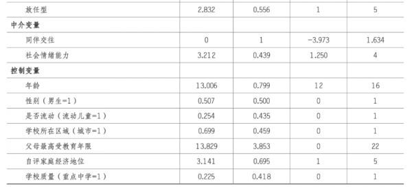 (2)如果教养方式对校园欺凌存在影响,是否是通过社会情绪能力和同伴交往这两条路径而发生作用的?本文的研究结果有助于从家庭动态视角理解青少年校园欺凌的产生过程,对于探寻防治校园欺凌的有效途径、营造安全的校园环境、助力青少年健康成长具有重要的现实意义。