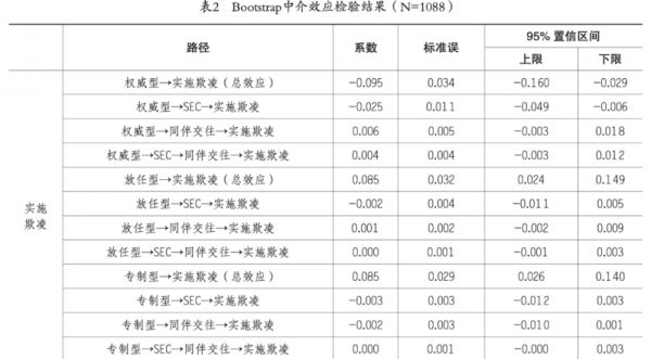 根据表2可知,在实施欺凌方面,只有权威型对实施欺凌的间接效应是显著的,专制型和放任型教养方式的间接效应不显著。具体而言,权威型教养方式通过社会情绪能力进而降低实施欺凌行为的间接路径是显著的(B=-0.025,CI=-0.049,-0.006),可以认为社会情绪能力在权威型教养方式和实施欺凌行为之间起着中介作用。