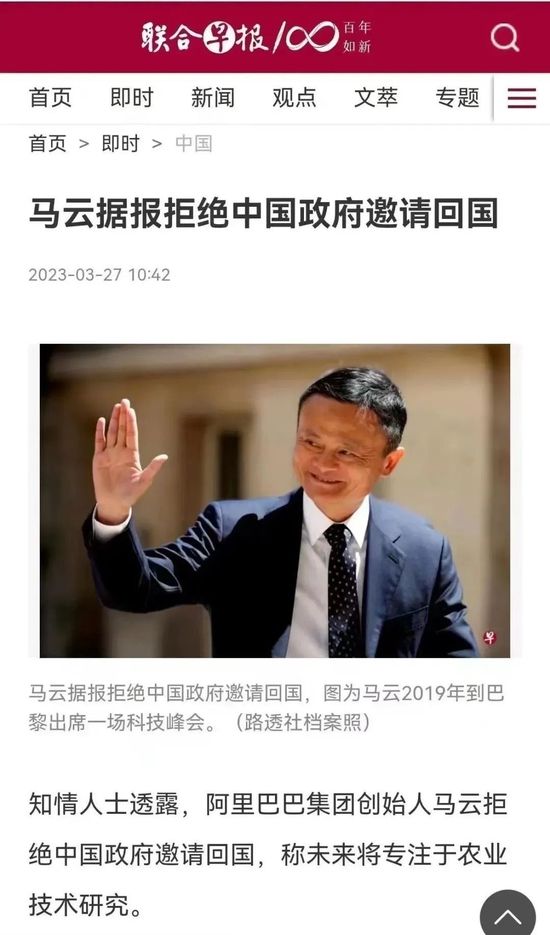 第二,这一点就有意思了,今天早上联合早报刚刚发布了“马云拒绝回国”的消息。联合早报大家知道吧?是一家获准在中国大城市发行的海外华文报纸,简单说就是新加坡报业。