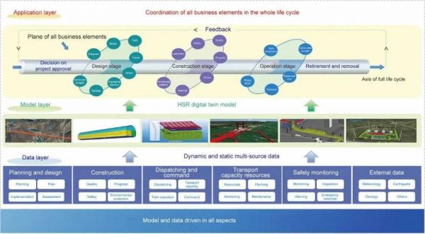 全生命周期涵盖了京张智能高铁的设计、施工、运营等阶段,全业务要素协同指不同生命周期的多个业务要素整体协同、综合最优。例如,设计阶段需要统筹路基、桥梁、轨道、隧道、工经、地质、通信、信号等要素,施工阶段需要统筹投资、安全、质量、进度、环保等要素,运营阶段需要统筹工务、电务、客流、运输、车辆和安全保障等要素。