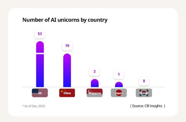 根据全球科技市场追踪机构CB Insights的数据,截至2022年12月,美国的AI独角兽数量最多,有 53 家初创公司。中国以19家位居第二,其次是英国有4家,但韩国却没有AI独角兽公司,而即使是国内生产总值(GDP)低于韩国的以色列也有 3 家。