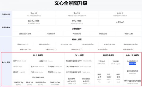 比如百度在2019年发布了文心大模型。和悟道AI一样,文心大模型也是诸多模型的统称,包括NLP、CV(机器学习)、跨模态大模型和生命计算大模型四个类别36个大模型。