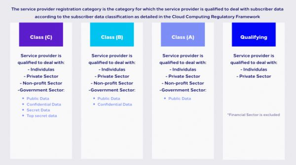 当地,围绕着云计算的基建、生态和监管标准正在迅速成型。沙特阿拉伯通信、空间和技术委员会(CST)在不久前正式颁布了对云厂商的标准认证,将其分为Class C、Class B、Class A、Qualifying四个等级,并由此决定其服务范围。