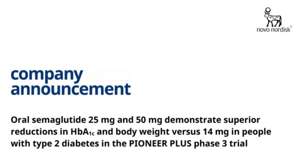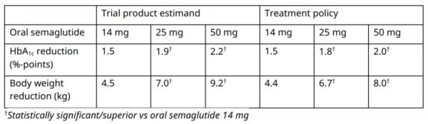 这项临床试验对比了更高剂量的口服司美格鲁肽(25mg、50mg)与此前已获批的14mg剂量在治疗2型糖尿病的效果。该临床试验达到主要终点,在治疗第52周时,25mg和50mg剂量的口服司美格鲁肽对糖化血红蛋白(HbA1c)的降低效果显著优于14mg剂量,减重效果也同样显著优于14mg剂量。