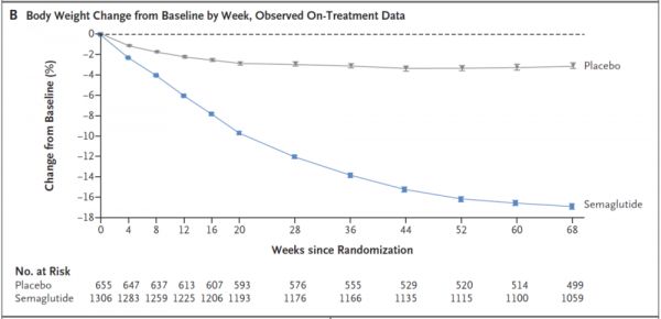 2021年2月,国际顶尖医学期刊《新英格兰医学期刊》(NEJM)发表了一项全球性大规模临床试验【1】,涉及全球16个国家1961人,临床试验结果表明,司美格鲁肽(Semaglutide)效果突出,相比安慰剂组,每周皮下注射2.4mg司美格鲁肽的实验组平均体重减轻了15.3公斤。