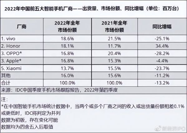 一季度手机出货量排名出炉:OV荣耀都是第一?